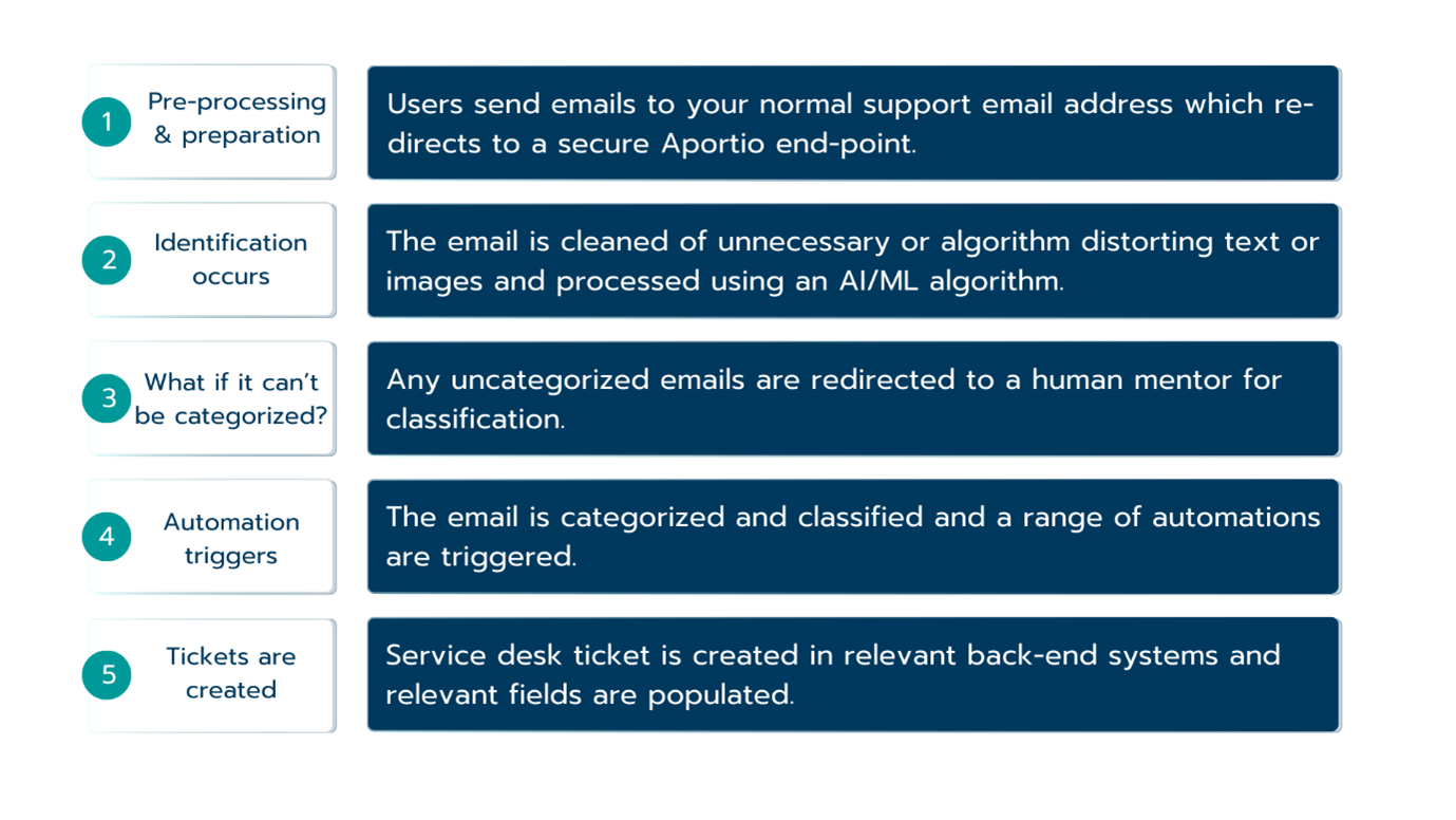 Once your customer mailboxes are configured to relay emails to Aportio, there are a number of steps undertaken. Your end users email your current service desk email address as they do currently. Email requests or tickets are then redirected to Aportio where they are cleansed, categorized, a ticket is logged in your ITSM system and automations are triggered. This happens seamlessly from the users’ point of view.